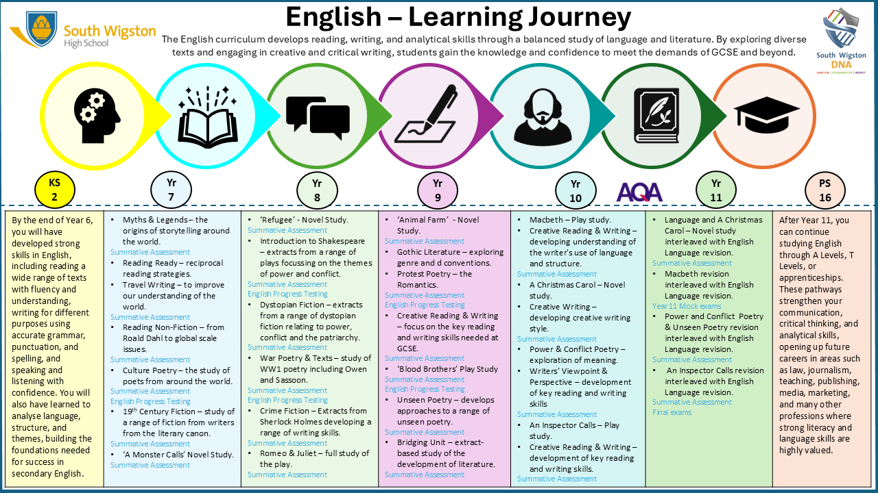 Our English curriculum ensures that students leave South Wigston High School with the ambition to engage critically, the determination to refine their voice, and the respect to understand and reflect upon diverse perspectives.