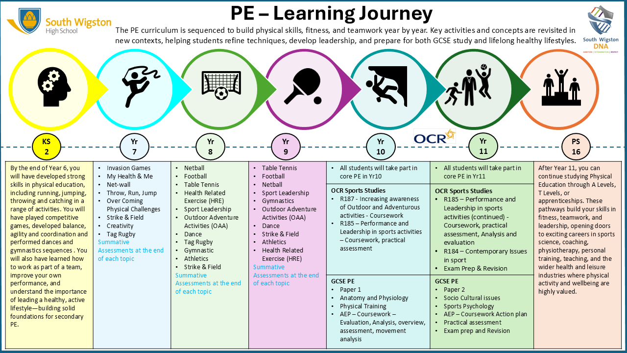 The curriculum is designed to create a strong foundation of knowledge and practical skill in a wide range of sports, preparing students for success at Key Stage 4. There is a clear progression pathway into our OCR GCSE PE and OCR Sports Studies courses. The curriculum is fully inclusive, ensuring that all learners have the opportunity to succeed.